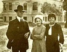 First National Pictures Secretary Harry O. Schwalbe, Mary Pickford dressed for her role in the film Daddy-Long-Legs (1919), and Mary's mother Charlotte Hennessey.