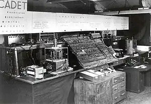 Cooke-Yarborough described CADET as being "probably the second fully transistorised computer in the world to put to use", second to an unnamed IBM machine.[3] Both the Manchester University Transistor Computer and the Bell Laboratories TRADIC were demonstrated incorporating transistors before CADET was operational, although both required some thermionic valves to supply their faster clock power, so they were not fully transistorised.[6] In April 1955 IBM announced the IBM 608 transistor calculator, which they claim was "the first all solid-state computing machine commercially marketed"[7] and "the first completely transistorized computer available for commercial installation",[8] and which may have been demonstrated in October 1954, before the CADET.