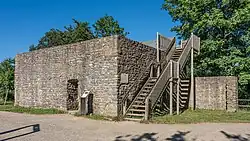 The remains of the walls on the Großer Burgberg summit are open to the public. The layout of the castle and its remnants are explained on information boards at the site. It had two different bergfrieds; the square one has been partially rebuilt in modern times (see photo). One interesting feature is the wide moat driven through the rock that separates the castle complex into an east and a west wing, linked by a modern stone bridge. The castle well drew drinking water from the nearby Sachsenbrunnen, an enclosed spring in the woods. In medieval times, the water was transferred over several hundred metres in wooden pipes.
