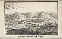 The ruins of the Große Harzburg are located above the spa town and the Radau valley, on the top of the Großer Burgberg hill at a height of 482.80 metres (1,584.0 ft). The summit can be reached by the Burgberg Cable Car and has an outstanding view past the neighbouring summit of Kleiner Burgberg (436.50 m (1,432.1 ft)) in the northwest over the northern Harz Foreland with the Harly hill range and far into the North German Plain. Southwards, the view goes over the densely forested mountains of the Harz National Park up to the Brocken massif.