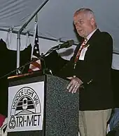 Construction of the Westside MAX project began in 1993. In November 1996, Hillsboro and TriMet named the yet-to-be-completed station at the western end of the project as the Mark O. Hatfield Government Center Station.[1] Hatfield was retiring from 30 years as U.S. Senator and previously used his political clout as Chairman of the Senate Appropriations Committee to ensure funding for the project.[1] In June 1998, after completion of the station but prior to its opening, government officials held a dedication ceremony at the station.[2] Hatfield, who had by then retired, was in attendance as the station was officially dedicated in his honor.[2]