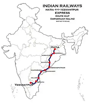 • 12836 – leaves Yesvantpur Junction every Wednesday and Friday at 8:30 hrs IST and reaches Hatia the next day at 19:05 hrs IST.