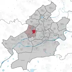 Location of Hausen (red) and the Ortsbezirk Mitte-West (light red) within Frankfurt am Main | |