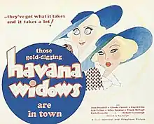 Havana Widows is a 1933 American pre-Code comedy film directed by Ray Enright, starring Joan Blondell and Glenda Farrell.[1][2][3] It was released by Warner Bros. on November 18, 1933. Two chorus girls travel to Havana in search of rich husbands. Their target is Deacon Jones, a self-appointed moralist who cannot drink without getting drunk.