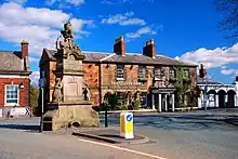 Hawarden (/ˈhɑːrdən/ ; Welsh: Penarlâg) is a village and community in Flintshire, Wales. It is part of the Deeside conurbation on the Wales-England border and is home to Hawarden Castle. In the 2011 census the ward of the same name had a population of 1,887,[1] whereas the community of the same name, which also includes Ewloe (which also has a castle) Mancot and Aston had a population of 13,920.[2] The scenic wooded Hawarden Park abuts the clustered settlement in the south. Hawarden Bridge consists of distribution and industrial business premises beyond Shotton/Queensferry and the Dee.[3] The west of the main street is called The Highway, its start marked by the crossroads with a fountain in the middle, near which are public houses, some with restaurants.[n 1]