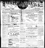 The first issue of The Hawkesbury Herald was published on 24 April 1902 by William Henry Pinkstone and Frederick William Collison.[1] Pinkstone and Collison published the newspaper until 1940.[1] The newspaper continued to be published after 1940 until 1945 when it was merged into the Windsor and Richmond Gazette.[1] The Windsor and Richmond Gazette is now published as the Hawkesbury Gazette.[2][3] The newspaper was circulated in townships along the Hawkesbury River including Windsor, Richmond, Castlereagh and Marsden Park.[1]