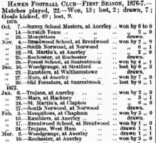 Although the club claimed a foundation date of 1875,[1] its first reported game was against a Surrey School Masters select on 7 October 1876, ending in a 6-0 win.[2] The first match against a regular club was against Mosquitoes F.C. on 28 October 1876. The match ended goalless, after a Hawks goal was disallowed as Mosquitoes noticed that the club had 12 men on the pitch.[3]