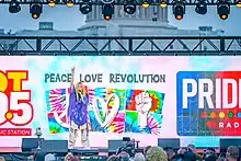 Since publicly coming out, Kiyoko has been an advocate for LGBT rights and is widely considered to be a gay icon by her fans,[104] who have nicknamed her 'Lesbian Jesus'. Her music videos highlight her own experiences and various LGBT-related issues. The music video for "One Bad Night" raised awareness of violence against transgender women.[99] For Pride Month 2017, Kiyoko partnered with MeUndies to promote their "Celebrate" campaign. Each pair of underwear sold had a portion of the profit donated to the Los Angeles LGBT Center.[105] In 2018, Kiyoko critiqued Rita Ora's song, "Girls", for its depiction of same-sex attraction and harmful implications for the LGBT community. Ora later apologized for the song's implications.[106][107][108] After 78 bras were thrown at Kiyoko during the Expectations Tour, she and Neara Russell donated them to I Support The Girls, an organization that supports homeless women, to support homeless LGBT youth.[109][110] In her acceptance speech for Push Artist of the Year at the 2018 MTV Video Music Awards, Kiyoko dedicated her win to queer women of color.[73] She marched in a Pride parade for the first time, attending the 2019 World Pride Parade in New York City as the float ambassador for W Hotels Worldwide.[111]