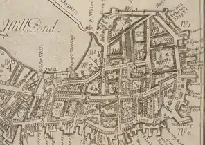 The mouth of Mill Cove was dammed in the 1640s, turning it into Mill Pond.[2]:74 Several mills and rum distilleries, powered by tidal water flows, were built on the shores of the pond.[3]