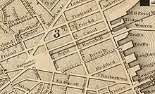 In 1807, the town of Boston gave the Boston Mill Corporation (under the leadership of William Tudor and Harrison Gray Otis,[6]) permission to begin filling in the pond.[2]:80[7] A street plan for the filled land was proposed in 1808 by Charles Bulfinch.[2]:81 Filling of the pond to create the area now known as the Bulfinch Triangle was completed in 1828.[2]:92 The fill material was obtained by cutting down a portion of Beacon Hill.[5][2]:84 The future location of Haymarket Square, where Merrimack, Canal, and Charleston Streets converged at the southern tip of the Bulfinch Triangle, appears on an 1826 map.[8]