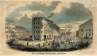 From its opening in 1845 to its demolition in 1897, the most prominent building on the square was the Boston and Maine Railroad depot.[17] According to an 1892 guidebook, "The Boston and Maine Railroad, alone of all lines entering the city on the north side, enjoys the privilege of penetrating within the outer street. Its station is in Haymarket Square, and the open space in front of it gives prominence to the structure."[18] The railroad provided service to Lowell, Portland, and Lake Winnipesaukee.[19]:139