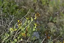 Hazardia rosarica is a species of flowering shrub in the family Asteraceae commonly known as the El Rosario goldenbush.[2] Hazardia rosarica is a fragrant shrub characterized by its zigzagged branches, toothed glutinous leaves, and yellow flower heads of only disc flowers. This species is endemic to Mexico and is only found in the region near of the town of El Rosario in Baja California. It is usually found on north and east facing slopes and ridgetops close to the coast.[2][3]