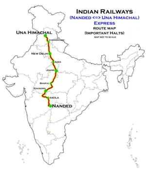 The 22457 / 58 Hazur Sahib Nanded Una Himachal Express used to run from Hazur Sahib Nanded via Purna Junction, Akola Junction, Itarsi Junction, Bhopal Junction, Bina Junction, Agra Cantonment, New Delhi, Ambala Cantonment Junction to Una Himachal.[4]