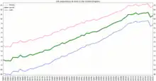 In 2013, life expectancy at birth was 83 years for women and 79 for men.[6] In 2016, life expectancy was found to be rising more slowly in the UK than in comparable nations.[7][8] In 2018, life expectancy in the UK stopped increasing.[9] There were 50,100 excess deaths during winter 2017/2018, mostly among older people, and the highest number since 1976; cold weather and problems with flu vaccine were blamed.[10]