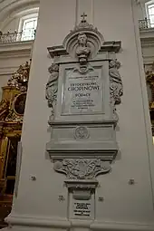 The clergy of the church were persuaded to move the heart in part due to the fact that the heart of novelist Klementyna Hoffmanowa was being kept in the Wawel Cathedral. With the support of apostolic administrator Antoni Ksawery Sotkiewicz, the heart was moved to the upper part of the church on 1 March 1879 and immured in the first pillar on the left, facing towards the church's great nave. The transfer of the heart took place in secret due to fears that Tsarist authorities would seize it. Composer Władysław Żeleński was one of the organizers of the transfer ceremony, which was attended by around a dozen people.[4][3]