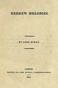 Nathan was an aspiring composer who was the son of a hazzan (synagogue cantor) of Canterbury, of Polish-Jewish ancestry, and was originally educated to be a rabbi. He had published an advertisement in the London Gentleman's Magazine in May 1813 that he was "about to publish 'Hebrew Melodies', all of them upward of 1000 years old and some of them performed by the Ancient Hebrews before the destruction of the Temple."[1] At this stage, he had no words to go with the melodies which he intended to adapt from synagogue usage (although in fact many of these tunes had originated as European folk-melodies and did not have the ancestry he claimed for them). He initially approached Walter Scott, before writing to Byron in 1814.[2] Eventually Byron was encouraged by his friend Douglas Kinnaird to take up Nathan's proposal.[3] Many of the poems were written during the period of Byron's sessions with Nathan between October 1814 and February 1815; a few, including "She Walks in Beauty" and "I speak not – I trace not – I breathe not", predate their meeting.[4]