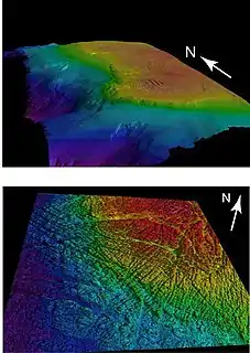 To the east, Heceta Bank is bound by a steep and smooth continental shelf.[1] In contrast, the bank's topography is relatively complex and irregular. In shallow depths (<100 m), the bank is composed primarily of rock and boulder outcrops, which are separated by small valley-like features. These valleys are presumed to have been created from the erosion of waves during historical periods when sea level was much lower than it is currently.[5] At greater depths, the seafloor transitions to smaller cobbles and fine-grain sediment, such as mud and silt.[2][5] This complex seafloor provides important habitat for many benthic-dwelling species, such as rockfish and other demersal species.[5] Furthermore, the irregularity in topography, caused by movement due to crustal uplift and transform faults, also allows for the release of methane gas from the sediment, which occurs from <100 to 600 m depth.[6]