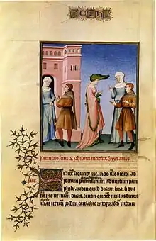 An early 15th century French manuscript depicts a scene in Hecyra, from the collection of the Bibliothèque de l'Arsenal.