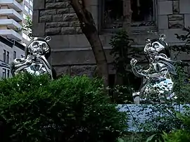 Hehe Xiexie depicts two "cuddly" Giant pandas which, according to Huan, represent a "harmonious society, harmonious world [and] harmonious Expo."[1] They are made of mirror-finished stainless steel and measure 600 centimetres (20 ft) x 420 centimetres (13.8 ft) x 380 centimetres (12.5 ft) and 600 centimetres (20 ft) x 426 centimetres (13.98 ft) x 390 centimetres (12.8 ft).[3] They were manufactured by Zhang Huan Studio and donated by Tomson Group as part of the Collection World Expo.[3]