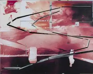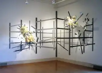Two installation-like works from 2000 were later noted for their uncanny prophetic quality in light of the subsequent 9-11 attacks.[7][22][35] Demo froze the implosion of a building in mid-air, complete with highly textured, blackened falling bricks and signage letters, flying shards and oozed neoprene smoke resembling popcorn;[24] it references vanished 1950s landmarks from Fasnacht's native Midwest.[4][22] The more violent and unsettling Exploding Plane offers a complex sense of space, drawing viewers' eyes into, around and through the work and its aluminum-gray scattering parts (including suitcases) suspended in midair.[36][4][3][37] After 9/11, Fasnacht turned from explosions to more celebratory and meditative drawings of civic parades and fireworks, exploding champagne bottles, and water occurrences that suggested both mourning and renewal.[22][7][38]