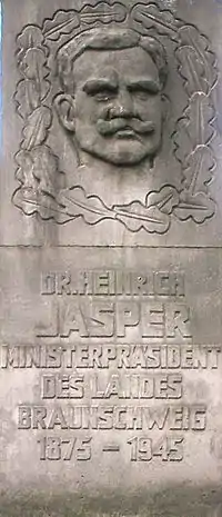 Jasper was a member of the Regional Legislature between 1919 and 1933. During this time he served as Minister-president of the Free State of Braunschweig (Brunswick) from April 1919 till June 1920, from May 1922 till December 1924, and again between December 1927 and October 1930.[2] During the decade his leadership of the party was undisputed. He almost always combined the office of minister-president with that of finance minister.