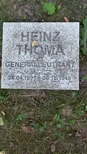 Thoma briefly commanded the 413th Landesschützen Division from 1 June 1942 until it was disbanded on 10 June,[2][10] before taking command of the 432nd Replacement Division on 3 August 1942.[2][11] Thoma's command was responsible for raising replacement units in Silesia.[12] Thoma was promoted to Generalleutnant on 1 September 1943 and except for a short period in September and October 1943, he commanded the division until the end of the war.[13] In 1944, Thoma's division was given responsibility for both replacement and training units, and this continued until early 1945. In the spring of that year the division was incorporated into the field army.[12] At the end of the war, he was also the deputy commander of Wehrkreis VIII, the military district of Breslau (Silesia, the Sudetenland districts of Bohemia and Moravia, and southwest Poland).[1] He was held as prisoner of war in NKVD special camp No. 48 in the Soviet Union, died on 30 October 1948 in a hospital at Shuya near Ivanovo, and buried in the camp cemetery.[1][14]