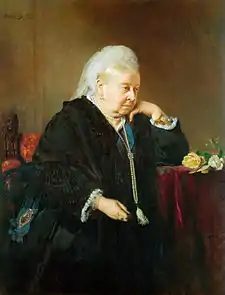 The success of Angeli at painting society portraits was partly due to his skill in depicting uniforms, pearls, and other jewels.[3] Unlike painters such as Franz Xaver Winterhalter, Angeli worked in a naturalistic style and preferred to portray his sitters as they were. His 1875 portrait of Queen Victoria earned him praise from the monarch for its honesty. As well as royal figures and politicians, he painted other notable people, such as the German chemist August Wilhelm von Hofmann. In 1877, Buckingham Palace invited Ulysses S. Grant to have his portrait painted by Angeli.[4]