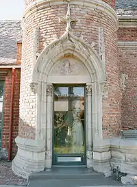 The castle-like building was built in 1928 for noted muralist Anthony Heinsbergen (1894-1981), and designed by Curlett & Beelman in a Late Gothic Revival and Romanesque style. The building's notable features include the prominent cylindrical tower, a Renaissance-style mural in the tower arch, and the detailed friezes displaying artisans at work. At least 11 buildings designed by architect Claud Beelman have been listed on the National Register. The building was constructed while Heinsbergen was employed to create murals for Los Angeles City Hall, and he had his building on Beverly Boulevard built using bricks from the old city hall.[3]
