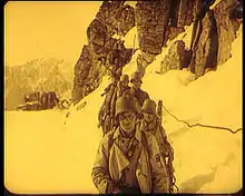 The creator of Heldenkampf in Schnee und Eis remains unknown, but it may have been the work of the cameraman and later director Gustav Ucicky.[5] At that time, film was still a very new form of propaganda. Ein Heldenkampf in Schnee und Eis consists of exterior shots on the Alpine front in Trentino-Alto Adige/Südtirol, where battles were being fought in the mountains at 2,000 to 3,000 meters.[6] These offered an opportunity for each side to portray its soldiers as heroes, the fight in snow and ice demonstrating strength and superiority over the enemy and allowing each side to emphasise the effectiveness of its own weapons and warfare. A silent film, it had title cards between shots as was normal, but was presented without musical accompaniment in the cinema, which was unusual.[6]