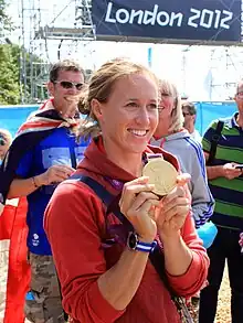 On 1 August 2012, Glover and Stanning won the gold medal in the women's coxless pair at the 2012 Summer Olympics. Having already set a new Olympic record of 6 minutes 57.29 seconds in the heats, they finished the final ahead of Kate Hornsey and Sarah Tait of Australia, and Juliette Haigh and Rebecca Scown of New Zealand.[36][37][38] The architect of their victory, coach Robin Williams, had prepared them for the final by engaging them in the word game Boggle for 45 minutes before their final call.[30] This was Team GB's first gold medal of London 2012, and the first ever Olympic gold medal for British women's rowing.[36][37] As with other gold medal winners, Royal Mail issued a commemorative stamp showing their celebrations, plus painting a post box gold in her home town of Penzance.[39][40] Within a week of winning her medal she broke it and thus received a replacement.[18]