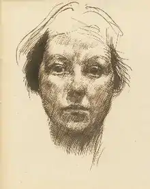 Imprisoned a few days before Helen Spanton was her suffragette friend and relative Katie Edith Gliddon, who had also been a student at The Slade (from 1902), and was arrested for breaking a Post Office window. Katie Gliddon had sewn pencils into her coat and kept a clandestine diary and sketchbook.  She made an important record of the life of suffragettes in prison.[15] These diaries were dedicated "'To the memory of Helen Margaret Spanton. Born at Bury St Edmunds. Died at Blackheath".[16]  Katie Gliddon was the model for In an Alcove (1902).  Helen Spanton and Katie Gliddon were both related to members of the Hardy family that included numerous artists, amateur and professional.[17]