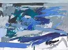 The following year one of Herzbrun's paintings was included in a Baltimore Museum of Art exhibition that was intended to give a comprehensive overview of the Washington scene over the previous two decades.[32] Paul Richard, a critic for The Washington Post, gave this show an intemperate review, calling it insensitive, haphazard, and incoherent. In it he said Herzbrun's painting was an "eye-curdling canvas."[33] His view of a solo exhibition of hers some four years later was considerably more positive, describing the show as a happy one and her paintings as "colorful and free and bright."[34] Two years later the Corcoran chose Herzbrun along with John Robinson and Alma Thomas for a show called "Contemporary Washington Art" that was sponsored by the American Revolution Bicentennial Administration.[35][note 10] In 1978 she was given a solo exhibition and in 1980 a three-person exhibition at D.C.'s Rasmussen Gallery.[37][38][note 11] The following year cancer forced her to give up painting. Although she made collages for a time, the disease did not leave her and eventually brought about her death in 1984.[42] Posthumous exhibitions include a retrospective at the Watkins Gallery and a 2019 presentation called "Grace Hartigan and Helene Herzbrun: Reframing Abstract Expressionism" at the American University Art Museum.[42][43]