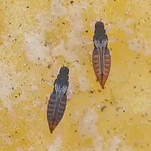 Adults have black thoraxes and yellow to dark brown abdomens,[12] but at the ends of their abdomens, they have an orange coloured tip.[10] Greenhouse thrips have a 10-segmented abdomen.[11] The bodies of the H. haemorrhoidalis are covered with cuticles that have an average thickness of 7.5 micrometers.[11] Their epidermis is made up of flattened cells and have a thickness of 3 micrometers.[11] The forewings of the H. haemorrhoidalis are very narrow and contain few short setae on the veins.[10] The legs of the greenhouse thrips have only a single-segmented tarsi.[10] The body length of an adult H. haemorrhoidalis varies between 1.2-1.8 mm long as adults.[10][11][12] The three pairs of legs on an adult is white in colour.[13]