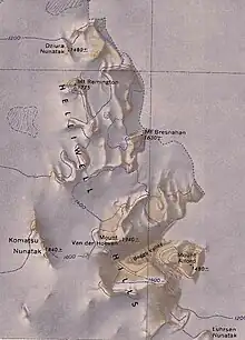 71°55′S 161°11′E / 71.917°S 161.183°E. A very prominent nunatak rising to 1,840 metres (6,040 ft) near its center. Located 4 miles (6.4 km) west of the summit of Mount Van der Hoeven in the west part of the Helliwell Hills. Mapped by USGS from surveys and U.S. Navy air photos, 1960–63. Named by US-ACAN for Stanley K. Komatsu, USARP biologist at McMurdo Station, 1966-67 and 1967-68.[9]