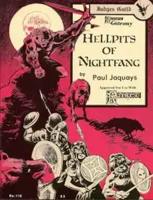 Hellpits of Nightfang is a low-level "gateway" adventure for beginning players. The 32-page book leads the characters to limestone caves located beneath a series of sinkholes.[1] The tomb of a powerful RuneLord is there, but a vampire with a love of gold has made a lair nearby, and vermin have surrounded his home.[2]