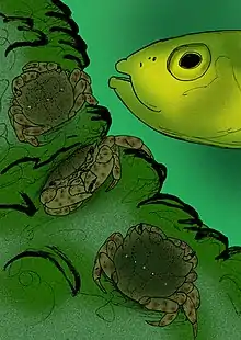 The chief difference between H. estellinensis and other species in the genus is the extensive pattern of rust-red spots on the animal's "drab green" carapace.[1] H. estellinensis also has a pair of conspicuous white spots near the ends of the H–shaped indentation on the animal's back, and another spot between each of those spots and the lateral margin of the carapace.[1] The legs are marked with larger spots than the carapace, and both the chelipeds and the walking legs are shorter than in other species. There are no spots on the animal's underside, including the abdomen.[1] In males, the chelipeds bear a hairy patch containing chemoreceptors on the ventral side of the claw.[1]