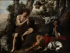 The catalogue of works of Hendrick de Somer compiled in 2014 contained 87 works.[11] His works deal principally with biblical and mythological subject matter. The attributions of work to Hendrick de Somer are based principally on the only three signed and dated works by de Somer: the Caritas Romana of 1635 in a private Roman collection and two versions of St. Jerome in the desert, one in the Trafalgar Galleries in London from 1651, the other in the Galleria Nazionale di Palazzo Barberini in Rome from 1652. The latter originally carried a fake de Ribera signature, which had been painted over the signature 'Enrico So[mer] f. and the date '1652'. Another key work for identifying the artist's work is the altarpiece of the Baptism of Christ (Naples, Santa Maria della Sapienza) of 1641, which can be attributed with certainty to de Somer since the documentation relating to its commission has been preserved.[7] This early work shows the artist's close connection with de Ribera. In particular it shows similarities with the Martyrdom of Saint Sebastian of Ribera (Museo di Capodimonte). Another influence in this work is the Flagellation of Christ of Caravaggio.[12] Later, like many of his Neapolitan colleagues, de Somer moved away from de Ribera's tenebrism in response to the growing taste for Roman-Bolognese art in Naples. His work shows no trace of his Northern origins.[10]