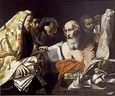 Hendrick de Somer is generally identified with the 'Enrico Fiammingo' mentioned as a pupil of Jusepe de Ribera by the Italian art historian and painter Bernardo de' Dominici in the Vite dei Pittori, Scultori, ed Architetti Napolitani (Lives of the Neapolitan Painters, Sculptors, and Architects) (1742-1743).[6] Until quite recently the artist was confused with a Dutch painter from Amsterdam with an almost identical name called Hendrick van Someren or Hendrick van Somer.[8] The credit for discovering the true identity of Hendrick de Somer is due to Ulisse Prota-Giurleo who discovered a record of an 'Enrico de Somer' acting as a witness in a legal procedure relating to the marriage of the painter Viviano Codazzi in Naples.[7] In the document the painter stated that he was at the time 29 years old and had lived in Naples for 12 years. This statement makes it possible to identify the year of his birth as 1607(it seems to be a false declaration : baptismal register Lokeren : baptized on 1602-08-27)[1][2] and to fix the year of his arrival in Naples as 1624. The statement further names the artist's father as 'Gil'.[9][1]