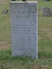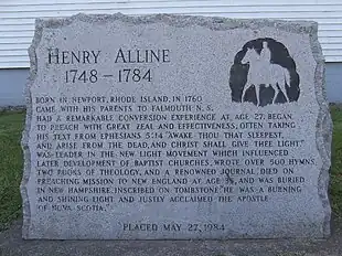 Alline fell mortally ill the last week of January 1784 while he was preaching at North Hampton, New Hampshire. The Reverend David McClure, a Calvinist minister, and his family took him into their home and provided him with whatever comforts they could extend to a dying man. On February 2, he died of complications arising from tuberculosis. McClure and his Church arranged for Alline's burial in their own church burying ground. The epitaph they had cut into his tombstone reads, "He was a burning and shining Light, and was justly esteemed the apostle of Nova Scotia."[10][11]