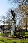 In October 1919, as World War I was drawing to a close, the Royal Academy in London held an exhibition of war memorial designs.[8] At the exhibition Fehr displayed statuettes of three figures, Peace holding a dove, a winged Victory and Saint George with a sword and shield.[8] Bronze statues of these figures appeared on several of the war memorials that Fehr created throughout the 1920s for British towns and cities. All three figures positioned on, or around, a stone obelisk, featured on the memorials Fehr created at Colchester, at Burton-upon-Trent, and, in different versions, on the Leeds War Memorial.[9][10] Several other memorials, including those at Lockerbie and Langholm in Scotland, at Eastbourne and at Grangetown in Cardiff, only featured the figure of Victory, holding a laurel wreath and an inverted sword, on a pedestal or obelisk.[8][9] The memorial at Keighley has a version of Peace with bronze statues of an infantryman in battle dress and a sailor holding a telescope.[10][11]