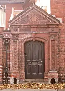 - Eastfield, 27 Wragby Road. Lincoln. 1893 A house which F. H. Goddard had built for himself shortly before his retirement. Art and Crafts in style, facing to the south, with a largely blank brick wall towards the road, but with a massive terracotta Elizabethan Renaissance revival doorway as an entrance from the road.[64] The terracotta was probably manufactured by the Lincoln firm of Fambrini & Daniels.