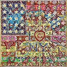 In 1974, the artist emigrated to the United States where he continued to work in the fields of visual art and experimental poetry, combining various art forms. Although he favored brightly colored painting, collage, and clothing design, these often contain verbal elements, such as his favorite, the ubiquitous logo “I [love] N.Y.” where the word “love” is replaced by a heart symbol.[8] The atmosphere of the New York art scene of the 1970s, which was dominated by the East Village movements, naturally provided a basis for Khudyakov’s further evolution as an artist. The East Village art scene, which brought together beatniks, performance artists, musicians, members of the Fluxus community, as well as gave birth to such celebrities as Jeff Koons, Keith Haring and Jean- Michel Basquiat, in many ways resonated with Henry Khudyakov. During this period, the artist’s tools were enriched by "found objects" from the streets of New York. He used them to produce his neckties, shoes, jackets, and shirts which acted as manifestos of his "ideal" world. Acquiring a new skin, made of badges, bottle caps, foil, adhesive tape, stickers, rhinestones, straws, sponges and toys, he would turn mundane objects into precious artifacts, offering new authenticity and new vision.[6] Henry Khudyakov would sometimes spend 20 years finishing a piece. He would record every addition on the back of the canvas focusing more on the artistic process rather than the finished product.