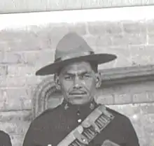 Nicknamed Ducky, Henry Norwest was Métis of Cree/French origins from the Hobbema reserve in Alberta. Henry reportedly earned his nickname during the war because he was very popular with women at dance halls, and would dance for hours before "ducking" out on the women at the end of the night.[3] Henry was married with three children, who were all sent to a residential school in Ermineskin, Alberta, prior to his enlistment.[3] His wife died in Alberta sometime before he was killed in action.[3] His three daughters became orphans upon his death, and spent most of their childhoods in a residential school.[3] Henry is buried in the Warvillers Churchyard Extension Cemetery, Warvillers, Somme, France.