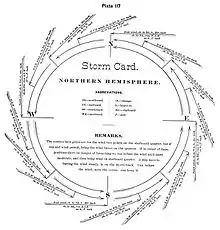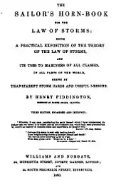 The result of Piddington's studies based on the logs of several ships, notably the Brig Charles Heddle which was trapped in a storm off Mauritius was his observation of the spiral wind tracks and he wrote a series of papers (24 memoirs in the Journal of the Asiatic Society of Bengal) on the topic.[4][5] He noticed that the storms had a calm centre and that the winds around them ran anticlockwise in the northern hemisphere and clockwise in the southern hemisphere. This was followed by a book, The Horn-Book for the Law of Storms for the Indian and China Seas the first edition of which was published in 1844. He produced a second edition in 1848 and he introduced the word "cyclone" derived from Greek κύκλος (kyklos, meaning "circle" or "ring") based on the helical nature of the winds. The idea of the horn book was that a translucent sheet (made of horn) with the diagram of the cyclone could be placed on a map so that the wind directions could be readily compared by any sailor to identify a cyclone so that a tacking course to avoid it could be followed. A review in Nautical Magazine (1848) however claimed that it reminded the author of a children's "horn book" to teach alphabets. The book ran into many editions and Piddington was even made a president of the marine court of enquiry at Calcutta in 1851. In 1853 he advised the Governor General that Port Canning was best not built on the southeastern side of Calcutta as it was vulnerable to storms. The Port was however built there and after Piddington's death, it was devastated in 1867 by a storm and abandoned a few years later.[1]