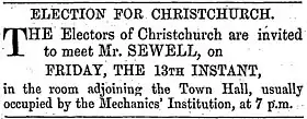 - 1 2 "To the Electors of the Town of Christchurch". Lyttelton Times. Vol. III, no. 136. 13 August 1853. p. 5. Retrieved 21 September 2012.