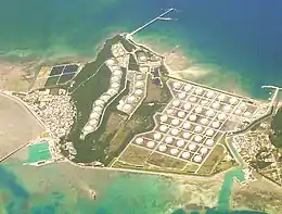 Its only village, Yonashirohenza, is located in the very south of the island and has a population of roughly 1,800, with the rest of the island being used for oil refineries and tank farms.[2] These oil refineries are restricted, meaning only the village and a road on the island's east side leading to Miyagi Island are open for public access.