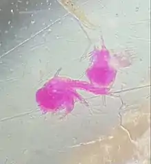 The flecked box crab is an opportunistic predator meaning they will tend to eat whatever comes across their path.[7] Because there tends to be a larger food source for these crabs during the summer, mating and therefore offspring increases when more food is available.[2] Reproduction usually occurs mostly in the spring and then again with reduced numbers in the fall.[8] Sexually mature males tend to be seen more often during late spring and summer[6] while females tend to reach sexual maturity in the late winter and early spring months.[8] Sexually mature males can mate with females in the winter and the females will hold the sperm until spring (which is the biggest time for mating but it still occurs continuously throughout the year).[8] Female crabs mate with males and store their sperm in an organ called the spermetheca, where they can then use it to fertilize their eggs a number of times.[8]