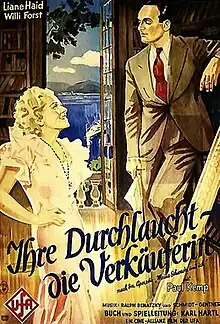 Her Highness the Saleswoman (German: Ihre Durchlaucht, die Verkäuferin) is a 1933 German comedy film directed by Karl Hartl and starring Liane Haid, Willi Forst and Paul Kemp.[1] [2] The film is based on the play My Sister and I by Georges Berr and Louis Verneuil. It was shot at the Babelsberg Studios in Potsdam. Location shooting took place around Lake Constance and Lindau in Bavaria.[3] The film's sets were designed by the art director Werner Schlichting. It premiered in Hamburg and first appeared in Berlin at the city's Gloria-Palast.[4] A separate French-language version The Princess's Whim was also produced.