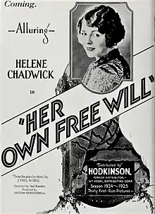 Her Own Free Will is a 1924 American silent drama film directed by Paul Scardon and starring Helene Chadwick, Holmes Herbert, and Violet Mersereau.[1] It was based on a novel of the same name by the British writer Ethel M. Dell.[2]