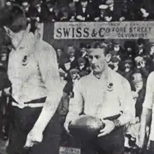 Moran leads the Wallabies out in the 1st match of the 1908 Tour at Devonport.